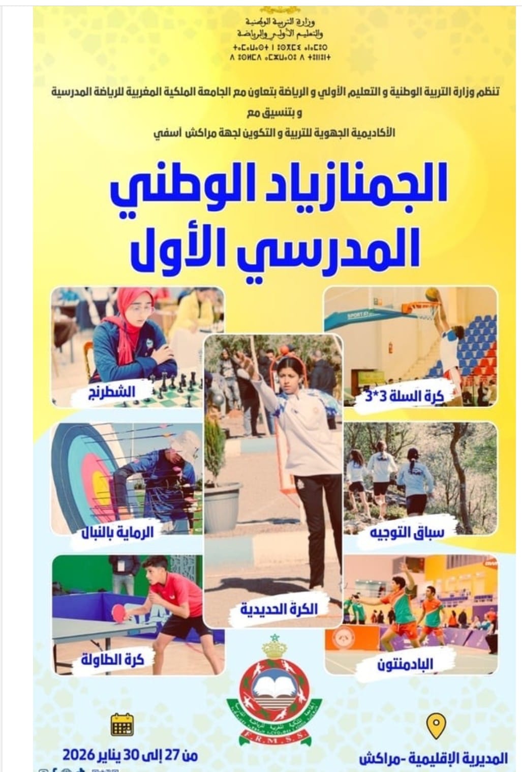 في إطار تنزيل مضامين المذكرة الوزارية رقم : 097X25 بتاريخ : 06 أكتوبر 2025 المتعلقة بتدبير وبرمجة الأنشطة الرياضية المدرسية للموسم الدراسي 2025-2026 ، تنظم وزارة التربية الوطنية والتعليم الأولي والرياضة ، بتعاون مع الجامعة الملكية المغربية للرياضة المدرسية ، وبتنسيق مع الأكاديمية الجهوية للتربية والتكوين لجهة مراكش–آسفي ، الجمنزياد الوطني المدرسي الأول ، وذلك خلال الفترة الممتدة من : 27 إلى 30 يناير 2026 بمدينة مراكش.