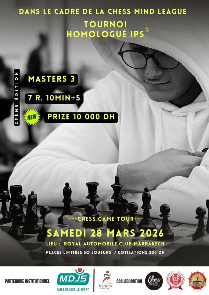 La Chess Game Tour annonce l’organisation de la 29e édition – Master 3, qui se tiendra le samedi 28 mars à 14h au prestigieux Royal Automobile Club de Marrakech.